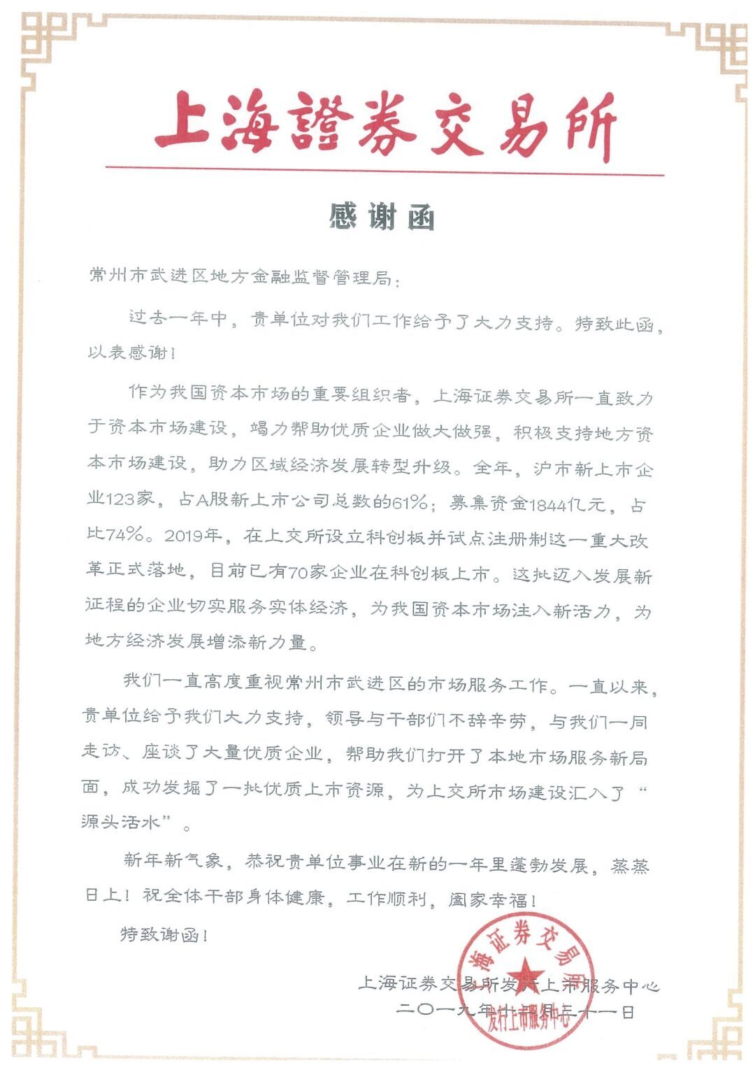 2020年1月9日,武进区地方金融监管局收到上海证券交易所发来的感谢函,来函表示,武进区金融监管局在2019年与上交所共同走访、座谈大量优质企业,打开了本地市场服务新局面,成功挖掘一批优质上市资源,为上交所市场建设汇入了“源头活水”,特致函表示感谢。