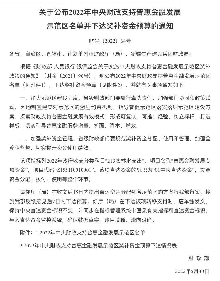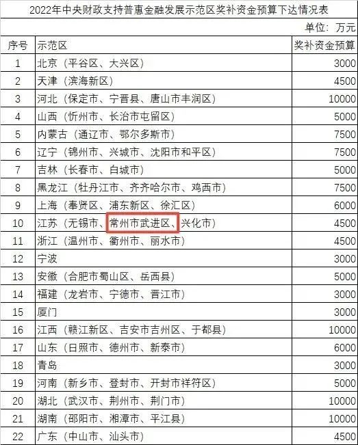 近日,财政部发布《关于公布2022年中央财政支持普惠金融发展示范区名单并下达奖补资金预算的通知》,公布2022年中央财政支持普惠金融发展示范区名单,武进区榜上有名。中央财政支持普惠金融发展示范区自2022年起实施,武进区也成为全省首批入选的三个地区之一。