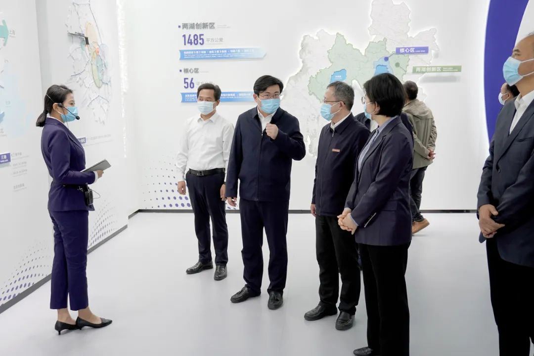 刘步健一行实地参观了“两湖”创新区规划展示馆,详细了解“两湖”创新区建设情况。紧扣规划、交通、项目、创新,我市着力打造“两湖”创新区,力争构筑面向长三角、面向未来的世界级生态创新湖区。“两湖”创新区规划展示馆承载着展示中心、接待中心、招商中心、指挥中心和青年中心五大功能定位。其中,展示中心以“生态创新区、最美湖湾城”为展陈主题,以“新城市、新产业、新人才”为展陈框架,将创意、科技、艺术有机融合,是集中展示“两湖”创新区美好蓝图及建设进展情况的形象载体,也是“两湖”创新区建设起好势、开好局的关键一环。