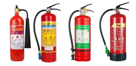 (从左至右依次为:二氧化碳灭火器、干粉型灭火器、水基型灭火器、泡沫灭火器)