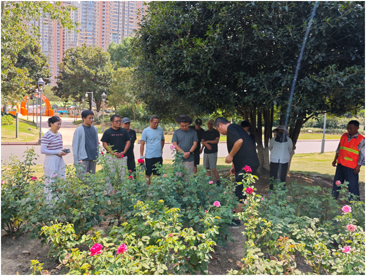 月季经过夏季盛开,目前已渐次枯萎,及时修剪有利于植物休养生息,孕育下一个花季。此次课程主题是控花修剪以及病虫害防治。老师先从理论上为大家详细介绍了月季的种类、花期和花期控制,接着示范月季促控修剪要点。月季花通过花后修剪、枝条调控和季节管理可实现花期控制,具体操作需结合残花修剪位置把控、株型调整和养分管理三大要素。需等待80%的花朵凋谢后统一修剪,避免分次修剪导致花期紊乱。同步修剪细弱枝、交叉枝及内向生长枝,提高通风透光率。修剪后要加强水肥护理,遵循浇水三原则:浇则浇透、间湿间干、干湿交替。施肥以腐熟的膨化鸡粪为主,每株用量为250克,如遇雨天,可在雨前增施复合肥,每株用量为10克;为加强植株的长势,可在大雨过后或浇透水后适当喷施红糖水,用3-5斤红糖水,30-40摄氏度的温水化开,以较高的雾化程度喷施于叶面。针对夏秋好发病虫害,如月季黑斑病、白粉病、蚜虫、月季叶蜂、蓟马、红蜘蛛等,应采取不同的防治措施。老师现场指导各养护单位学员轮流修剪,并耐心地指出存在的问题,帮助大家熟练掌握月季的修剪技术。