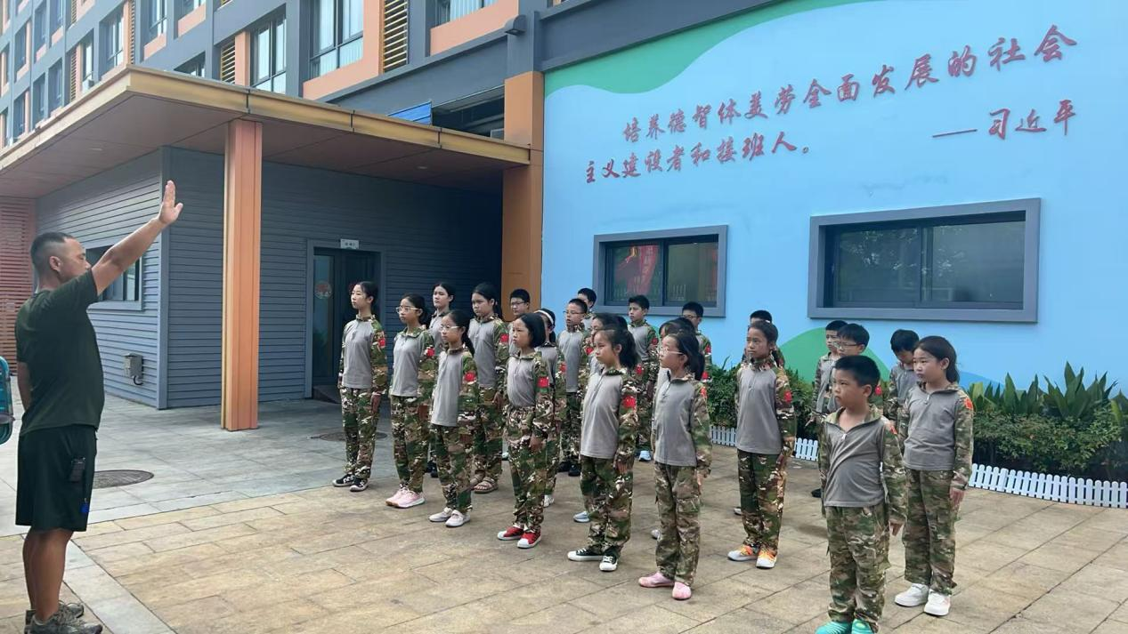 活动以“荣耀护旗手”仪式拉开序幕。孩子们身着迷彩服,在教官的指导下完成升旗任务。挺拔的军姿、铿锵的口号,展现了新时代少年的蓬勃朝气。随后开展的“铁血队练兵”训练中,孩子们系统学习立正、稍息、敬礼等基础动作,在一招一式的反复练习中领悟纪律与协作的重要性。