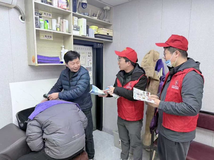 活动现场,在社区工作人员的引导下,志愿者们分为两组,同步开展服务工作。第一组志愿者沿社区主次干道,逐户走访沿街商铺,向经营者及从业人员发放安全宣传手册。志愿者们结合近期典型安全事故案例,提醒商户务必规范用电用气、及时清理消防通道、定期检查消防设施;针对商铺经营中可能遇到的电信网络诈骗套路,引导商户提高警惕,守护好自身财产安全。第二组志愿者聚焦社区内6家晚托机构,开展安全排查和宣传引导。志愿者们逐一检查各机构消防设施配备是否齐、灭火器是否在有效期内、消防通道是否畅通,并针对排查出的薄弱环节,现场提出整改建议。