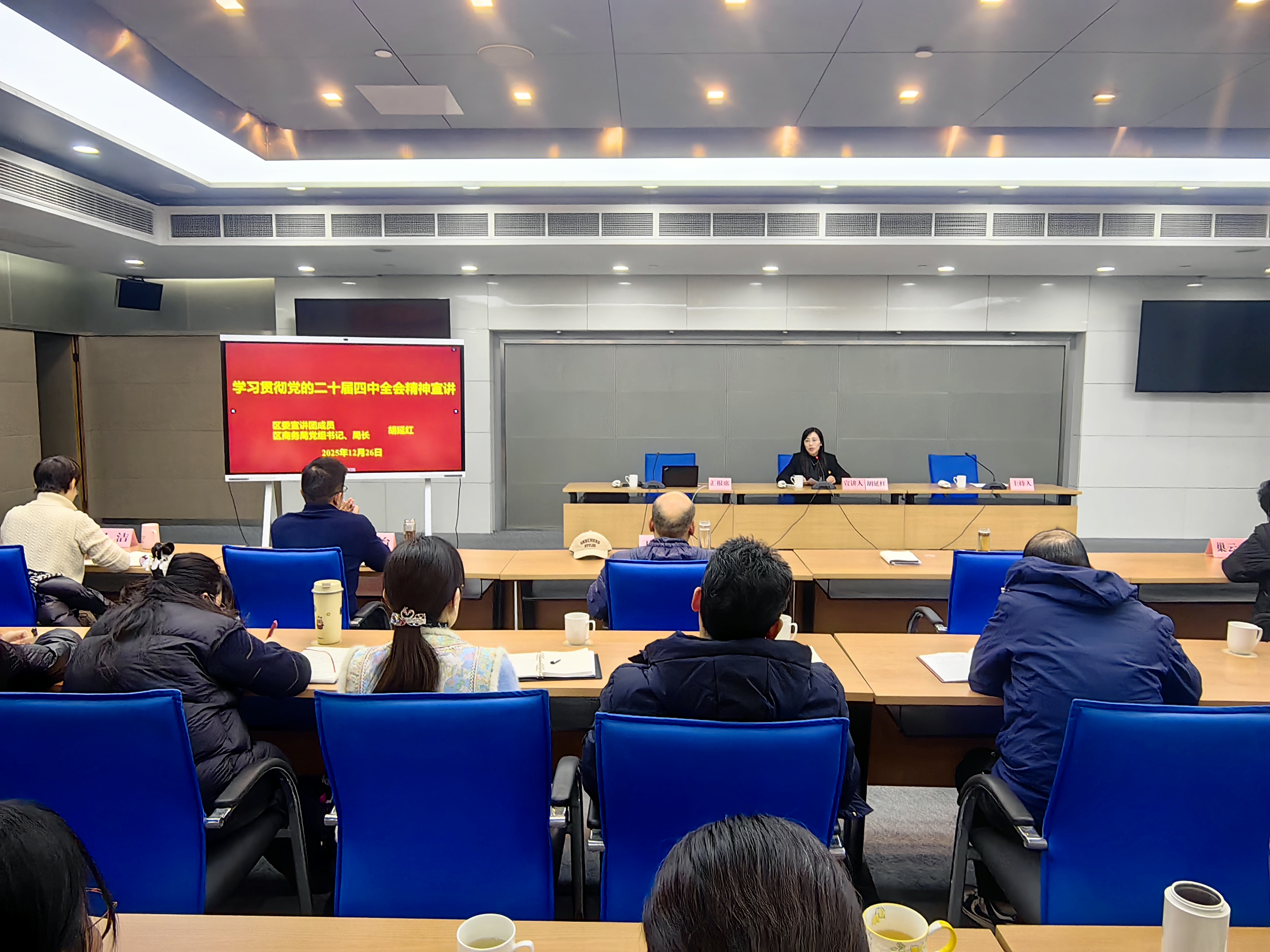 为深入学习宣传贯彻党的二十届四中全会精神,切实把全局党员干部的思想和行动统一到党中央决策部署上来,12月26日,武进区商务局召开专题宣讲会。区委宣讲团成员、局党组书记、局长胡延红作全会精神专题辅导报告,局全体干部职工及离退休党员代表参加会议。