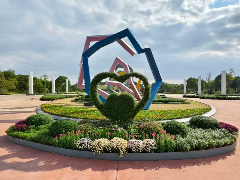 从花博园的北门进入,便是此次金秋菊展的核心展区,150余个品种的近3万盆菊花,组成“平安”“繁荣”“蝶恋花”“年年有余”“登高望远”等10组主题菊花造景,让人眼前一亮的同时,也为市民提供了观赏、打卡的的丰富选择。