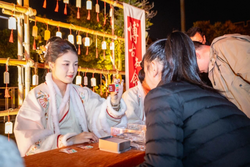 来自常州纺织职业技术学院的志愿者在四大互动体验区迎接八方群众——“玲珑巧套”“投壶问礼”“闻香识味”“博古知今”更是人气爆棚。想玩套圈?“玲珑巧套”的队伍拐了个弯;想试试投壶?“投壶问礼”区一座难求;连考验鼻子的“闻香识味”和烧脑的“博古知今”,都排满了跃跃欲试的市民。尽管要排队,但每个人脸上都洋溢着期待和笑容,丰富的互动体验让传统文化“活”了起来,也让每一位参与者成为了活动的真正主角。