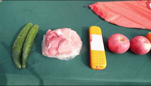 消防员事先准备了黄瓜、胡萝卜、苹果、猪肉、鸡胸肉等道具,并选用了市场上常见的直径约 1 毫米的尼龙材质风筝线。