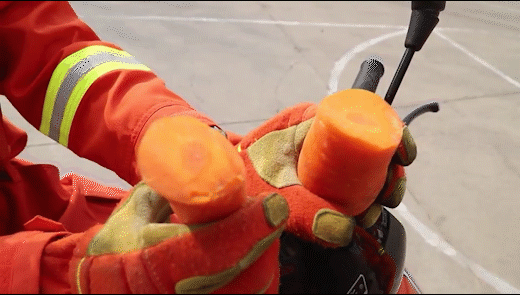 接着,消防员又测试了稍硬的胡萝卜和苹果,结果同样被轻松割开。