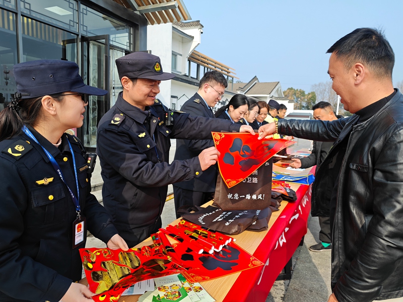 多部门执法人员走进江宜高速淹城服务区设置宣传服务点,向过往司乘人员发放交通安全宣传资料和春联福字等节庆饰品,向他们送上新春祝福。交通执法人员对服务区内的机动车维修经营户进行检查,核验其备案情况、经营范围、配件质量及维修操作规范,督促企业依法合规经营,优化服务措施,助力驾乘人员安心顺畅出行。