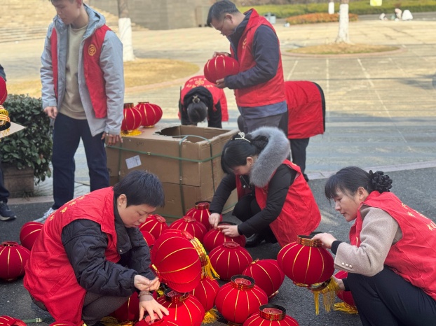 此次志愿活动,全体职工积极报名。参加活动的同志两两配合,撑灯笼、装笼盖、挂流苏,忙得不亦乐乎。在大家的共同努力下,完成了几百只灯笼的组装工作。随后,又配合安装师傅把组装好的灯笼悬挂到园内路灯杆上。象征着团圆与幸福的红灯笼点缀在公园主干道沿线,形成了一道靓丽的风景线,营造出浓浓的新春年味。