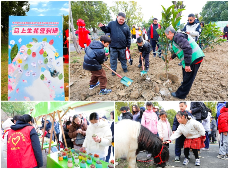 现场气氛热烈而温馨。“马上生花”签到墙上,彩叶拼贴出春日愿景;马年吉祥物“小马宝莉”惊喜现身,与大小朋友亲密互动。在绿化专家的专业指导下,亲子家庭齐动手,培土、浇水、挂心愿牌,在园区种下朴树、榉树、枇杷树。来自非洲的朋友也热情助阵,共植希望之树。