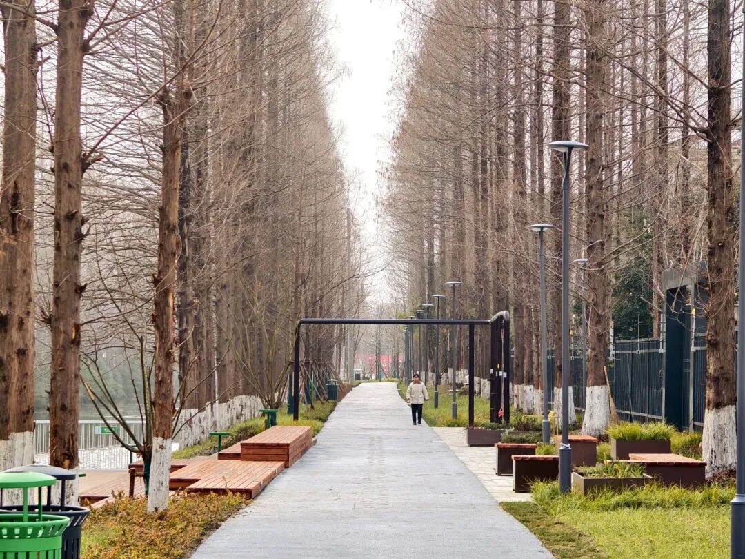 步道全长约700米,东起凤苑路、西至绿杨路,秉持“临水而居,亲水而戏”的理念,精心打造孩童游乐区、宠物乐园、健身步道等多元功能空间,满足不同年龄段人群的游园休闲需求。步道建设最大程度保留原生水杉林风貌,高大挺拔的水杉枝干舒展,春夏时节层层叠叠的枝叶织就一片天然穹顶,匠心独运的营造出“路在林下过,人在树间行”的独特生态景致。