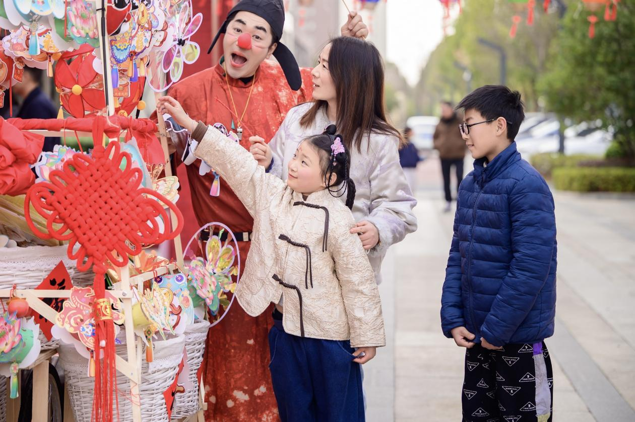 居民们身着唐风服饰或喜庆冬装,携家带口漫步市集。摊位琳琅满目:糖葫芦晶莹剔透,手绘脸谱色彩斑斓,中国结红得热烈,风车转出童年的欢笑。空气中弥漫着小吃香气与欢声笑语,处处洋溢着浓浓的年味儿。