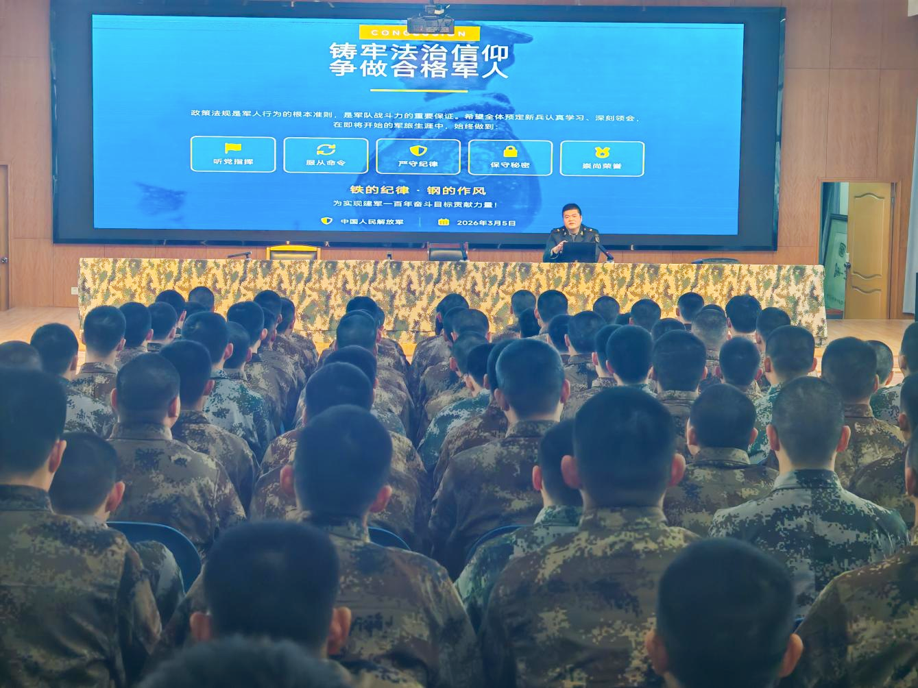 镇人武部领导对全区预征青年就部队政策法规进行授课。通过图文并茂相结合的授课方式,帮助预征青年更加清晰地了解部队法规,坚定信心向着奋斗目标出发。
