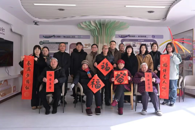 书写结束后,志愿者与老人们一同将带着美好祝愿的春联和“福”字,精心张贴在中心的大门、走廊和活动室的显眼处。顷刻间,整个康乐中心被装扮得红火热闹、年味十足,仿佛披上了节日的新装。