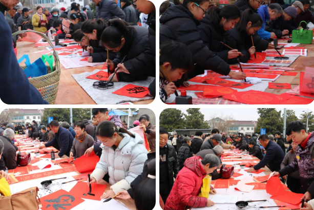 活动现场,“翰墨送福”区域尤为引人注目。来自湟里高中、湟里初中、湟里小学以及东安实验学校的十余名书法特长生,在本地书法名家的带领和指导下,与书法爱好者们一同挥毫泼墨。学生们虽显稚气却专注认真,一笔一划间勾勒出对新年的美好憧憬;书法家们气定神闲,行云流水般书写着吉祥与祝福。一幅幅笔力遒劲、寓意吉祥的春联,一个个形态各异、满载福气的“福”字,在他们手中诞生,带着墨香的温暖被免费赠送到居民手中。居民们或细心挑选心仪的联句,或耐心等待墨迹晾干,脸上洋溢着喜悦的笑容,将这份独具匠心的新春礼物和浓厚的传统文化韵味带回家中。