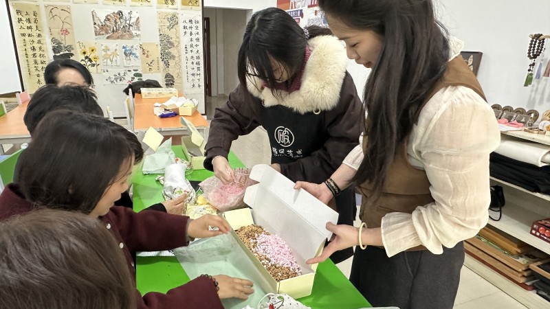 巧手制枕,香润芳华。合香珠作为传统香道非遗技艺,以天然本草为基础,不仅气味芬芳,还兼具安神助眠之效。在养生枕制作环节,大家根据自身对枕头软硬、高低的喜好,将合香珠、山楂籽等天然养生材料填入枕芯,打造专属养生枕。现场还贴心准备了精致的小布袋,多余香料可装袋封存,既能随身携带,也能置于衣橱枕边,让这份天然的芬芳在日常生活中静静延续。